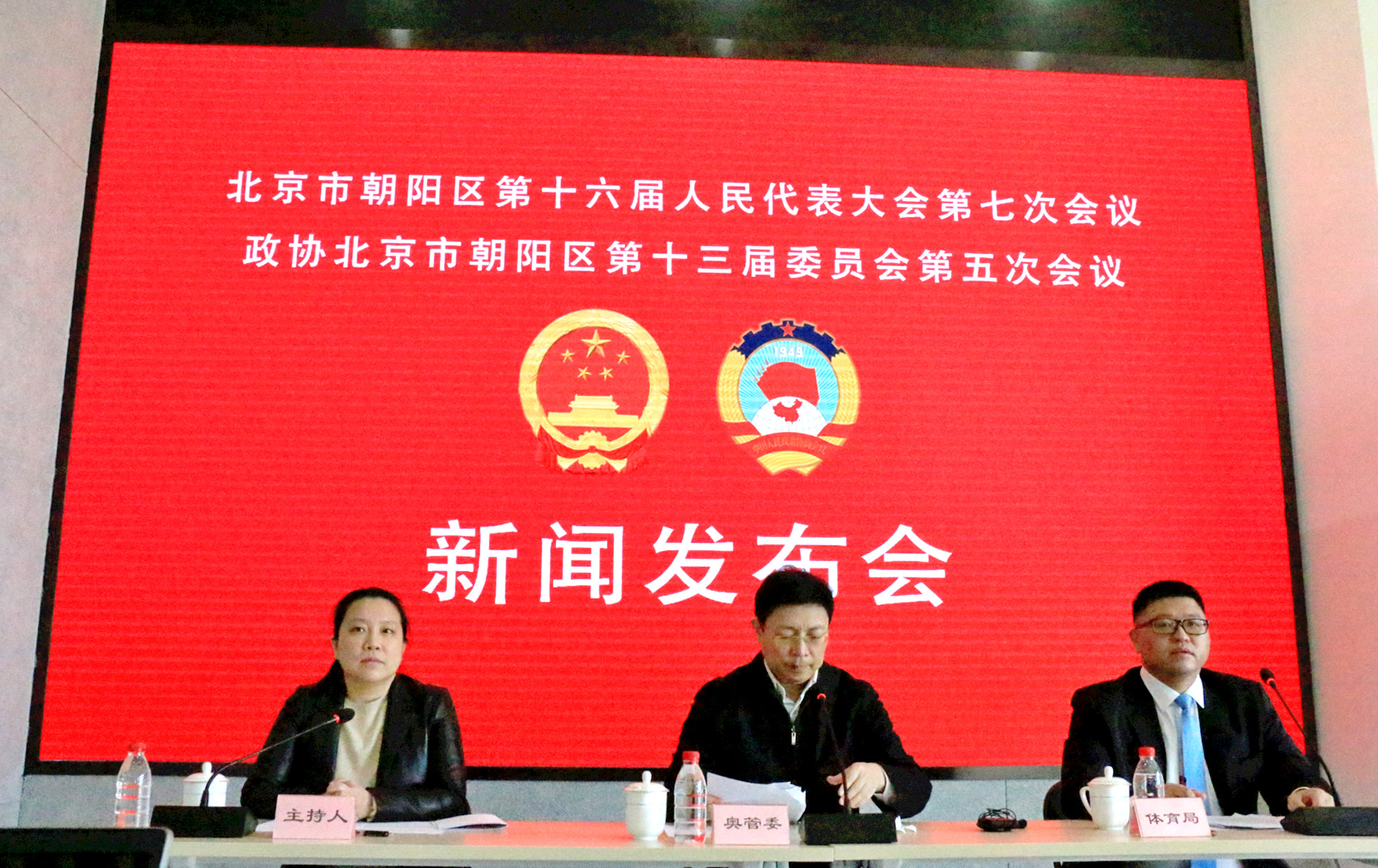 北京朝陽「兩會」新聞中心舉行冬奧主題新聞發佈會,北京奧林匹克公園管理委員會副主任楊平(中)、朝陽區體育局群眾體育科科長郭鵬出席發佈會(右)
