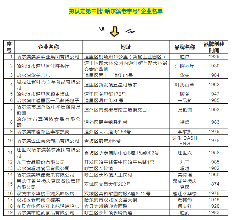 2020年11月2日,哈市商務局啟動了第三批「哈爾濱老字號」申報工作,經過初審、專家評審等程序,最終認定「勝洪」「江畔歺廳」「華美」「葉氏百草」等19個品牌為第三批「哈爾濱老字號」,其中,「老字號」創建時間最早的在1874年,品牌名為雙成蘭棱慶宴居。
