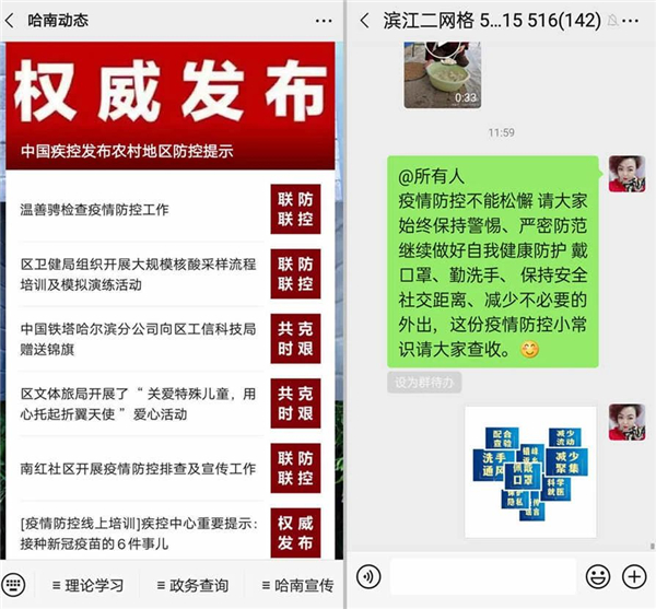 創新線上手段,實現全覆蓋。發揮好線上宣傳陣地作用,形成線上線下齊宣傳的工作格局。利用抖音、快手等新媒體平台,創新策劃群眾喜聞樂見的健康知識和預防常識宣傳小視頻10餘個,在區內廣泛傳播。在「哈南動態」微信公眾號開設「疫情防控線上培訓」專題,每日發佈疫情實況及疫情防控提示。充分利用業主群、物業群、社區群等500餘個微信群發佈防疫視頻、圖文和防護常識,提高居民防護意識。