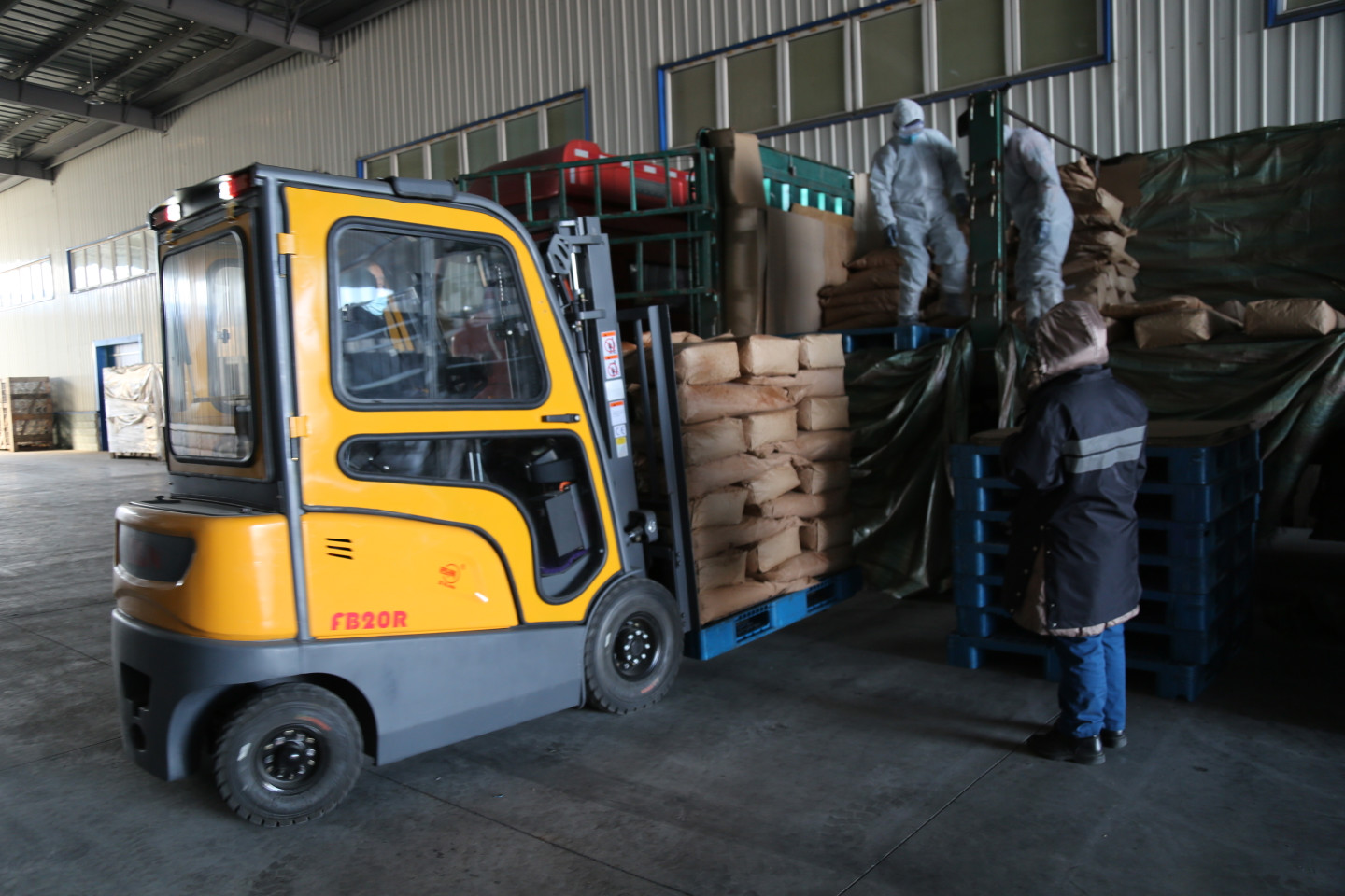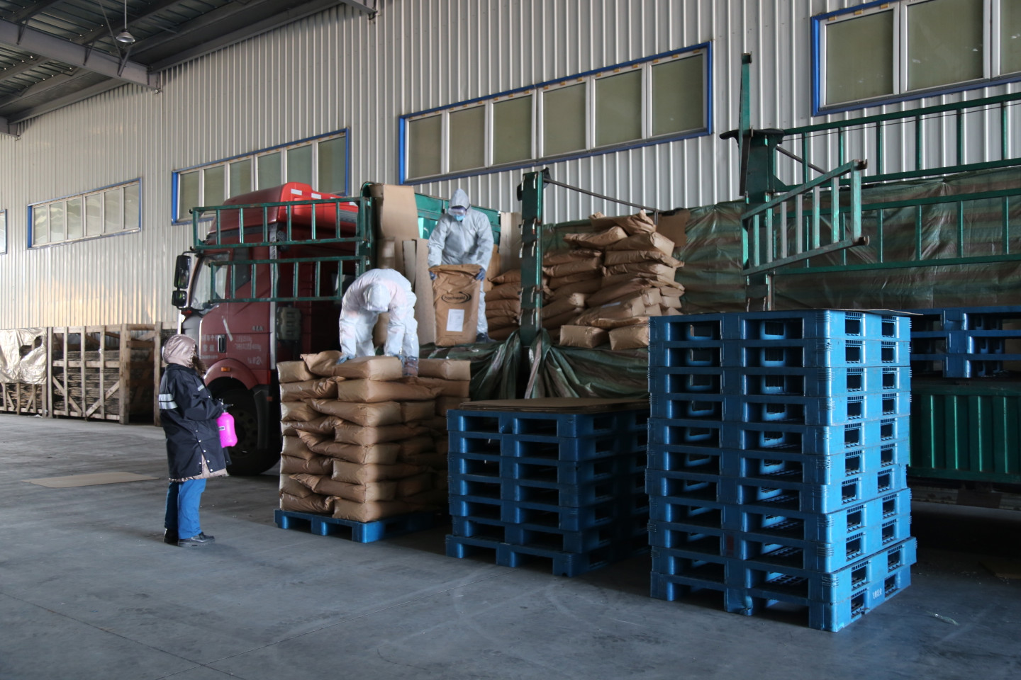在飛鶴乳業的倉庫區,記者看到工人們正在進行產品發貨和原輔料卸車工作。龍江縣工業信息科技局的工作人員正在對原輔料進行疫情防控檢查,查看檢驗檢疫證明、消毒記錄等相關手續。據飛鶴(龍江)乳品有限公司儲運供應部主管楊吉祥介紹:「我們員工進廠嚴格落實防疫『四寶』等措施,在原輔料裝卸過程中,裝卸人員必須穿戴防護服、裝卸前和裝卸後都進行酒精消毒,原輔料在庫房儲存過程中還要進行脫氧乙酸消毒。」