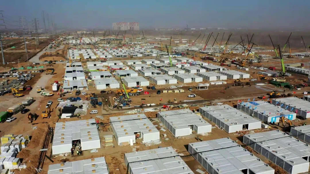 1月13日,石家莊啓動並全面展開黃莊公寓隔離場所建設,用於安置新冠肺炎密切接觸者和次密切接觸者。從土坡推平、地面硬化、板房到位開始吊卸,到電源、5G信號、配套設施同步搭建,截至1月17日16時,由中國鐵建、中國建築負責施工的第五、第七隔離分區的首批1008間集裝箱房屋成功交付,共用98個小時。