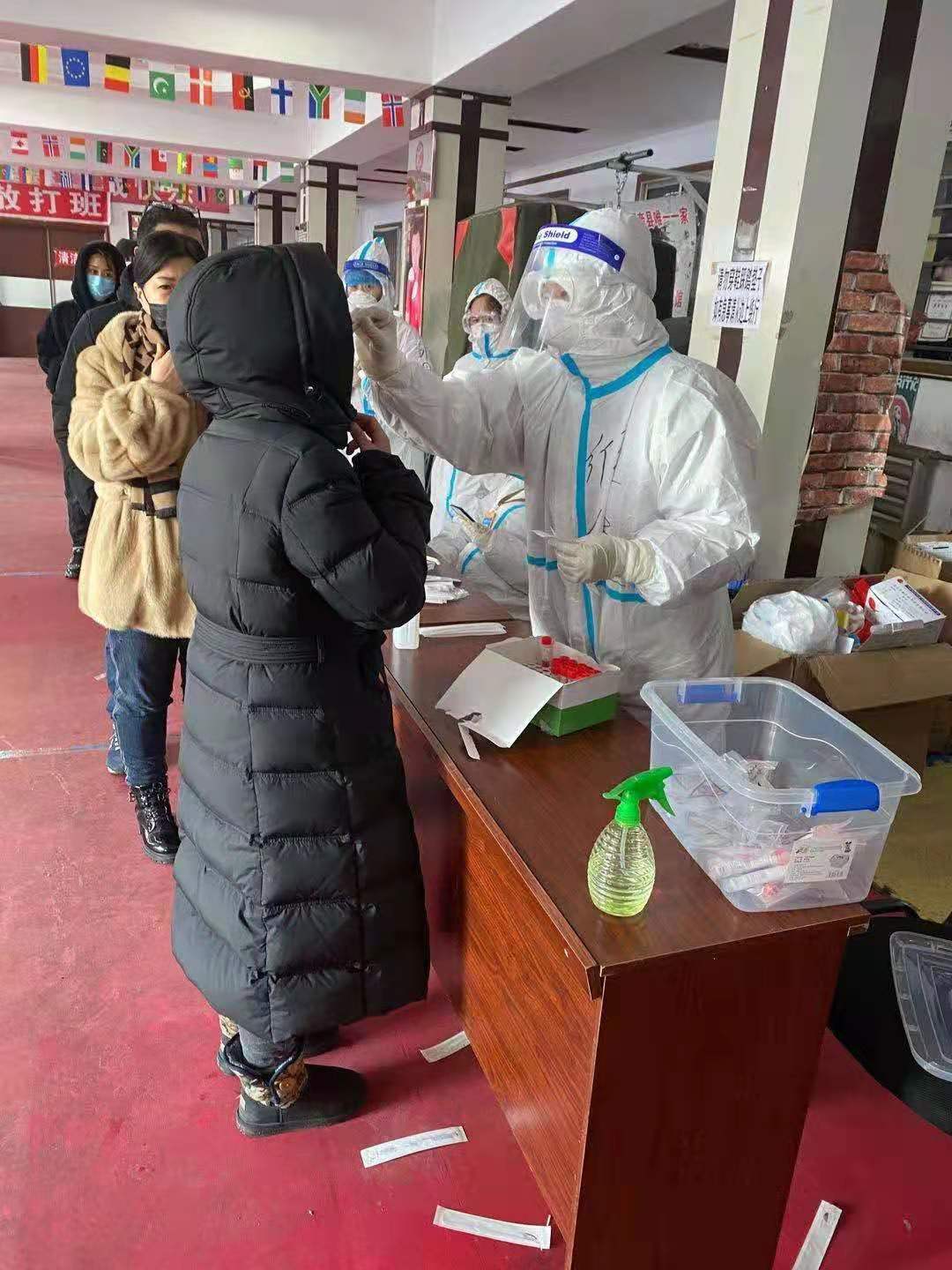 她們的工作環境艱苦異常,冒着東北零下十幾二十幾度的超低溫,長時間在室外採集樣本,一干就是一天,一站就是一天。屯子隔離的鐵柵欄、村頭搭建的簡易棚子、小區大門口、室外大空地,到處都能看到她們忙碌的身影。這期間她們穿着厚重的三層防護服,戴着護目鏡和兩層口罩,整個人就像被封在膠袋子裏,噁心乏氧,異常憋悶。