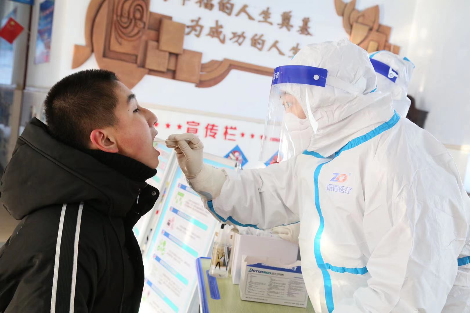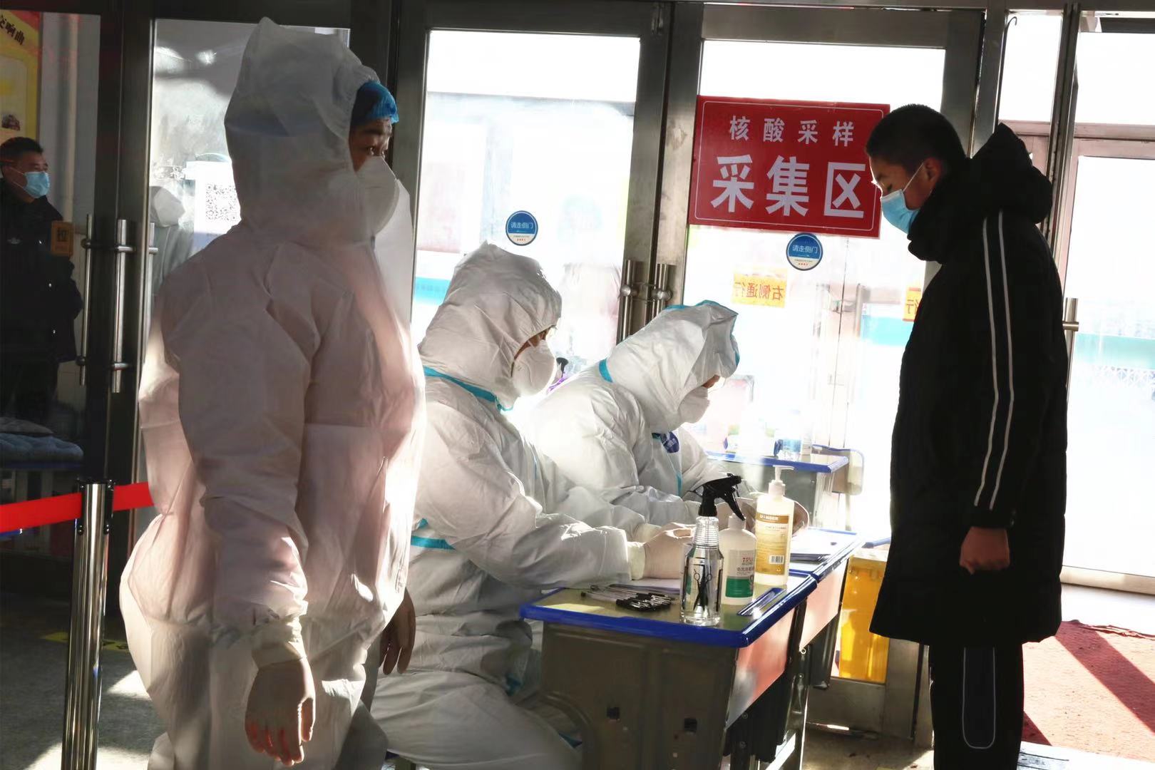 1月23日,在寶清縣職業高中采校點,學校門口,寶清縣農業農村局農業綜合行政執法大隊的工作人員們正在認真地組織群眾保持一米安全距離,引導大家有序出入。前來採樣的群眾自覺遵守「掃碼、測溫、戴口罩」的要求,核酸檢測採樣工作有條不紊。走進樓內,醫護人員和負責登記的志願者們身穿防護服,佩戴着口罩、護目鏡和醫用一次性手套,認真地進行登記、採樣。