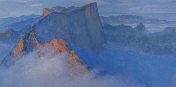 田學森繪畫的色彩也異常特別,進入了天空煙雲的深度、虛色的深度與心性的深度,尤其是最近兩年畫出的新作畫出了自然的氣色,比如《含章》上畫面上被一層薄紗與薄霧狀的紫氣縈繞,但又並沒有直接畫出煙雲,這是心念中的煙嵐之氣與煙霞之色,這是自然變幻與心氣感應在時間中熬練而成的心色與神色!這虛薄之色也是曠遠之色,是天地之寂寥所形成的虛色,這是持久關注光氣的穩定,自己的心志也要氣定神閑,才可能進入心曠神怡之境。
