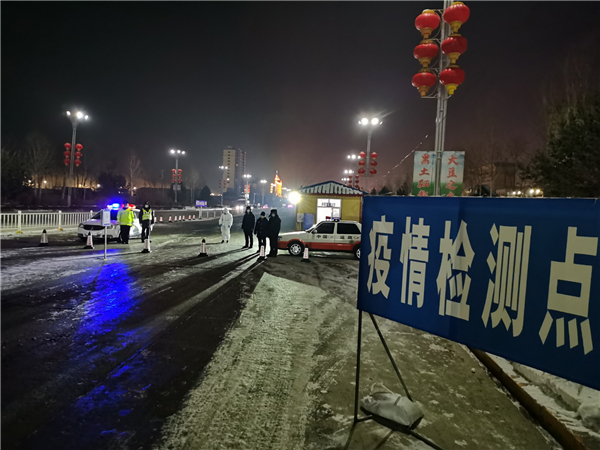 1月23日晚19點,室外溫度已降至零下28度。世紀大道卡口是海倫市外防輸入、內防輸出的重要防控屏障,公安、交通等部門工作人員仍是不敢鬆懈,冒着嚴寒引導入城人員在疫情檢測點完成掃碼、測溫、身份核查以及核酸報告、行動軌跡檢查。