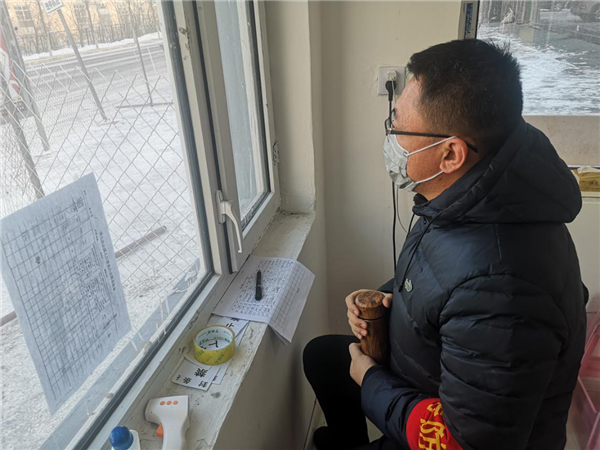 在南福小區值守卡點,海倫市人民辦事中心副主任郭寶輝負責當晚的夜班值守也就是要從晚上8點到第二天的早上8點,晚間最難戰勝的不是嚴寒,而是疲勞,為了不在執勤的崗位上睡着,他每隔一段時間就要在值守房外做做運動保持清醒。