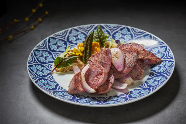 高溫岩燒過的牛舌,撒以黑椒調味,口感細嫩,厚切帶來的幸福感,啟動疲乏味蕾,純粹原始的鹹香即瞬蘊繞口腔。