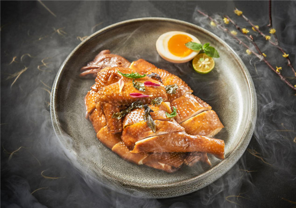 西湖的龍井遇上廣東的走地雞,是西子韻味與羊城粵味完美碰撞,配以煙熏加熱技法,龍井清香撲鼻而來,肉質鮮嫩,惹味可口,粵式美味是也。