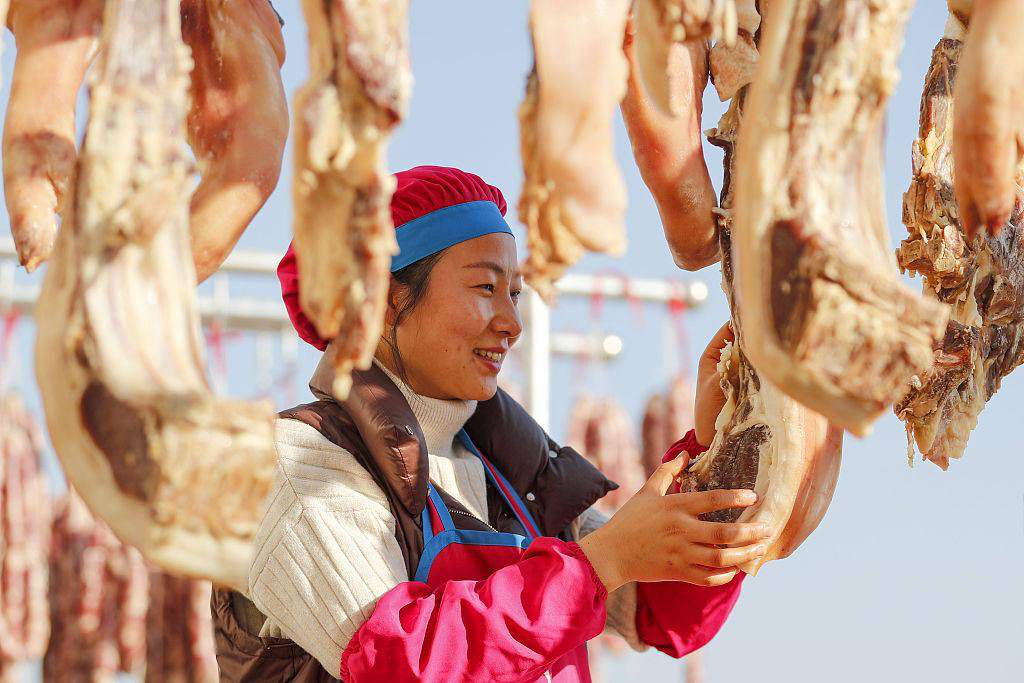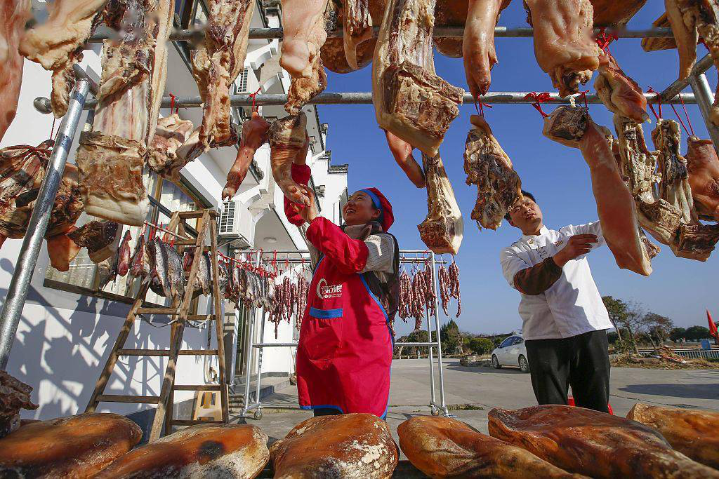 同樣受到大家歡迎的年貨還有徽州香腸、火腿等臘肉製品。在黃山市徽州區金家農莊,農莊主金模靈全家上陣,醃的醃,曬的曬,大家忙得不亦樂乎,整個農莊香氣四溢,讓人提前感受到新春的喜悅。金模靈告訴记者,從他爸爸做臘肉到現在,已經有十幾年了,這兩年,徽州火腿、香腸特別受到消費者的青睞。今年銷售量比往年還要多,冬至以來,火腿、香腸等臘肉製品已經銷售2萬餘斤。