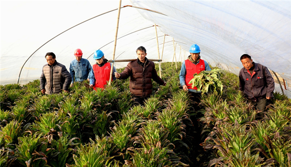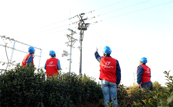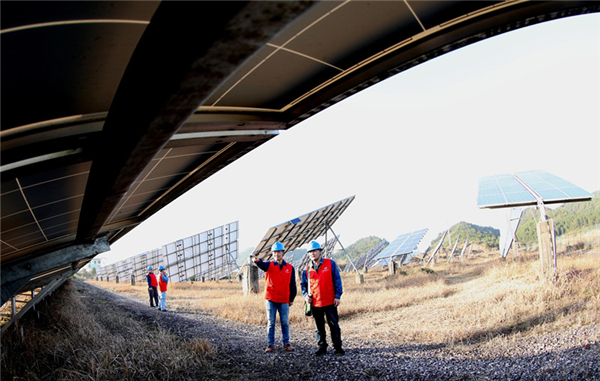 1月29日,安徽歙縣供電公司黨員志願者在王村光伏太陽能發電扶貧基地巡查,確保扶貧基地正常運行。