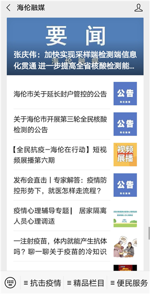 權威引導解疑心築同心。在官方媒體平台及時發佈海倫市出台的各項政策指令,公佈疫情防控形勢和進展,大力宣傳實行各項防控管制的必要性,呼籲廣大群眾聽從指揮、服從安排,聽黨話、聽官宣、不信謠、不傳謠,為群眾提供及時可信的獲息渠道。定期梳理群眾當前關注的熱點,特別是以民生保障為重點,聯合相關部門製作圖解、短視頻等進行導讀、解讀,邀請相關部門同志進入演播室,通過留言解答、在線諮詢、直播互動等形式製作專題節目,為群眾答疑解惑。