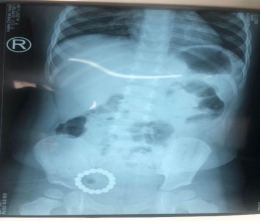 一周前,2歲的童童在家玩耍套在手腕上五顏六色的磁力手串,感到非常稀奇,當作「糖豆」吃進了肚,家長發現後觀察3天也沒有在糞便中發現磁力珠排出體外,於是緊急帶孩子來到哈爾濱市兒童醫院普外二科就診。劉冰洋醫師接診患兒後完善相關檢查,經腹部拍片和腹部超聲檢查顯示小腸有多枚金屬異物,其中跨越腸壁,腫脹明顯,考慮已造成局部腸壁穿孔。