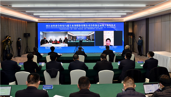 當天北京時間下午5時,瑞士時間上午10時,四川省內江市經濟合作局與瑞士水務股份有限公司舉行線上簽約儀式,雙方以「線連線」「屏對屏」形式,創新簽約方式,變「見面簽」為「網上籤」,順利完成各項簽約程序。