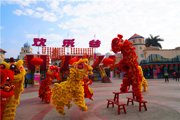 新春佳節,每天數十台新春演藝輪番上演,歌舞聯歡興味濃。國朝國風舞蹈、傳統樂器演奏、大型賀春舞台劇、新春歌曲連連唱……場場精彩不容錯過,載歌載舞喜慶新春。正月初一至初六,歡樂廣場每天還將進行醒獅表演,威武的獅子們用精彩的表演為遊客送上新春祝福,活靈活現的舞藝盡顯傳統南獅風采。