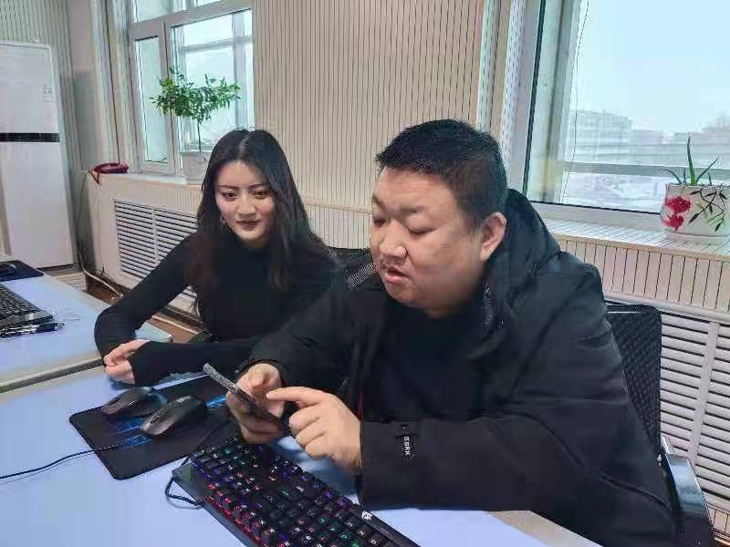 黑龍江富裕縣融媒體中的工作人員符文浩向同事陳萌講解着使用方法,講解後,陳萌把要說的話編輯完後發給了在老家的爸爸媽媽。