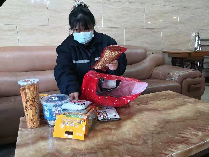 「今年不能回家過年了,但是心裏很溫暖,暖到心窩裏了。領導想的特別周到,為我們每個沒有返鄉回家過年的員工發了禮包和紅包。在這裏,希望給我的父母拜個年:爸媽雖然我在外地,但是很好,你們放心吧,祝二老新年快樂! 」郝福東感謝企業對他照顧的同時,也為自己的家人送去了新春祝福。