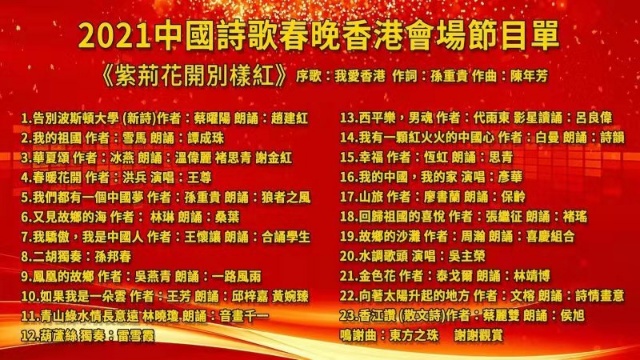 中國詩歌春晚香港會場於2021年2月6日舉行線上演出,並取得圓滿成功。晚會以喜慶樂曲拉開帷幕,「獅子山下春潮湧,紫荊花開別樣紅」,迎接2021辛丑牛年。晚會由香港青少年悅讀協會和國際華文詩人協會共同主辦,香港文化藝術界聯會、香港文藝報、中華文化藝術交流學會 、香港文化和旅遊協會、香港當代文學藝術協會、香港京港藝術協會 、香港詩人聯盟 、香港散文詩學會、優閱中文教育中心及雪馬藝術館等單位協辦,得到世界各地詩歌社团、诗人及各界人士鼎力支持,并紛紛致词祝賀。