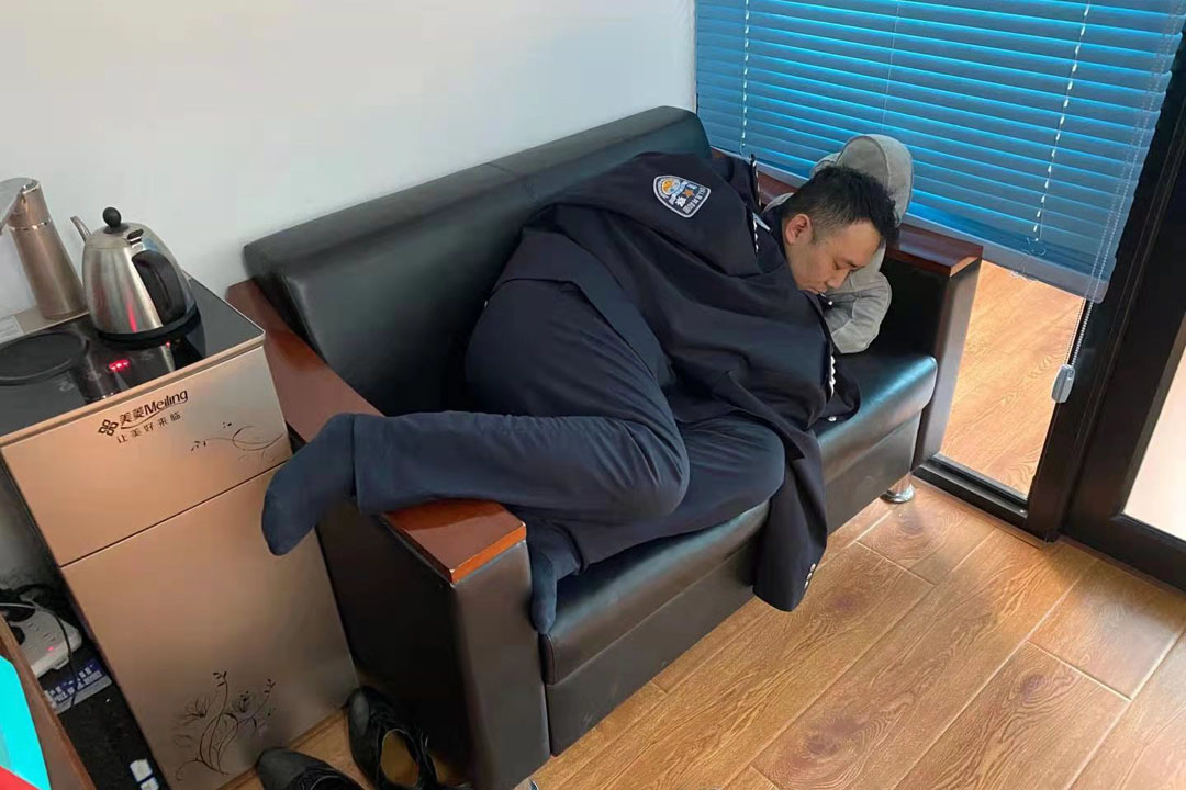 1米8的漢子 困得躺在近1米長的沙發里睡着了