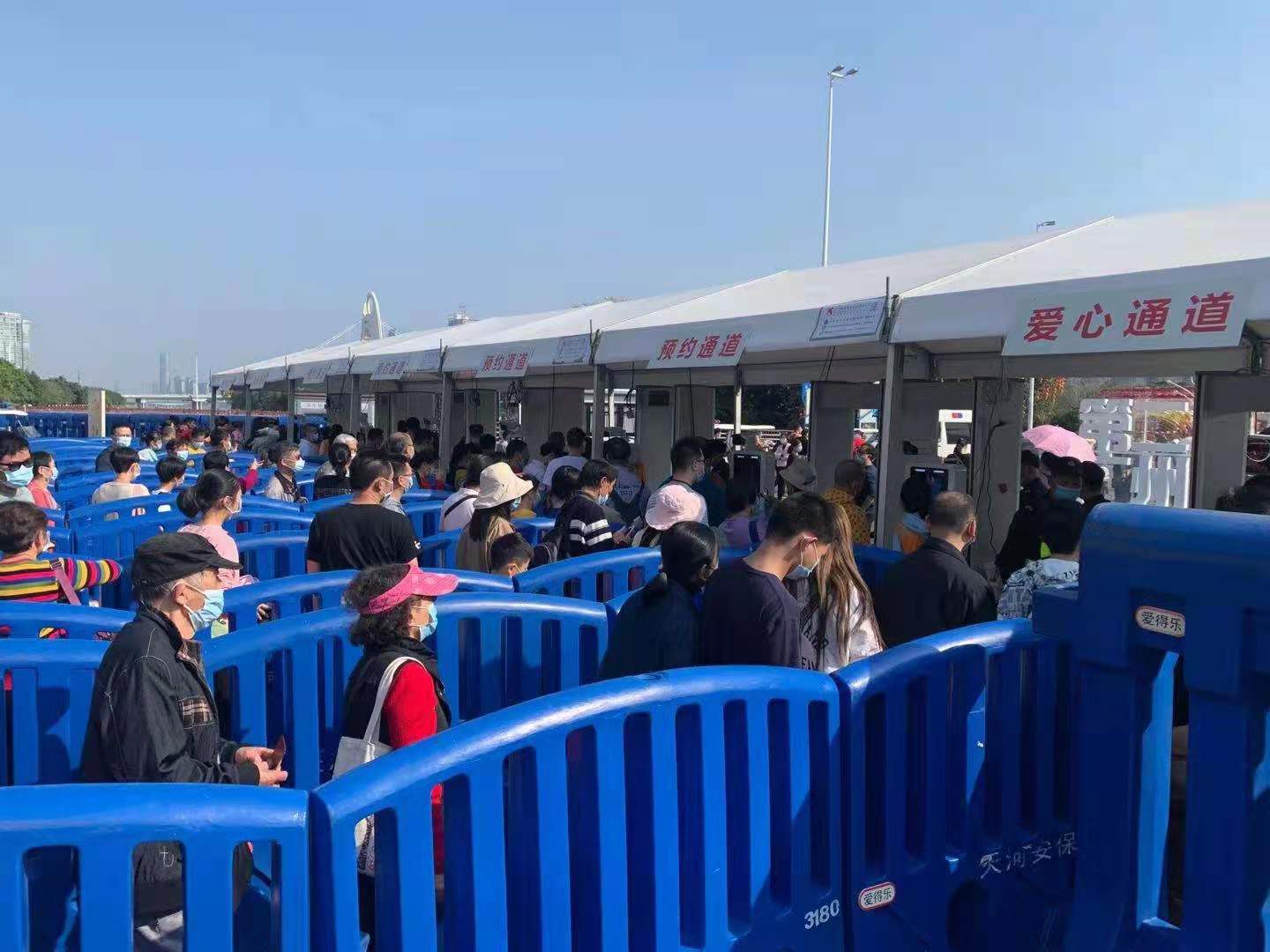 為了方便市民出行,天河區公安分局特地在海心沙園博會驗票區開闢了一條愛心通道,方便不會使用智能手機的市民以及持有老年證、軍人證、港澳台地區通行證和護照的遊客群體能夠快速完成身份驗證以及健康信息驗核等程序,方便市民出行。並安排兩倍人手負責該通道的檢票以及健康信息驗核工作,該項措施不僅有利於老年群體跨越數字鴻溝,更為沒有居民身份證的遊客群體提供便捷化實名制驗票的便利,據了解,負責治安維穩工作的天河區委政法委、區公安分局每天投入安保力量380人,將花城廣場分為南北中3個區域進行佈防,海心沙園博會現場核心區共設11條通道,花城廣場南廣場水馬線設定驗票緩衝區,花城廣場北廣場至外圍為管控區,落實各項管控措施。獵德街、冼村街每天共設立33個點,投入保障力量200餘人次,做好本區域秩序維護工作。
