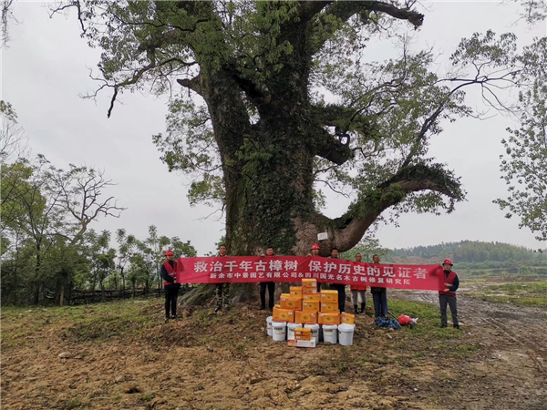 2020年4月4日,林業技術人員對分宜縣一棵簽一棵千年古樟樹精心防治複壯