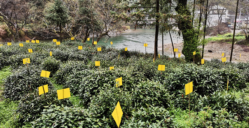 近日,在鶴城鄉境內,絕大部分茶園黃板已安插到位,青山碧水間,黃板搖曳,點綴在漫山遍野的茶園中,風景別致。漁塘村依靠茶農互助插黃板、新安源村利用統防統治隊伍集體作業,各村各出奇招,你爭我趕,力爭趕在茶季到來前,將所有黃板安插到位。