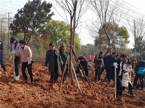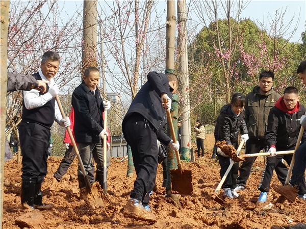 扶苗、揮鍬、培土、施肥……活動現場氣氛熱烈,大家踏着泥濘相互配合,細心種好每一株樹苗。經過兩個多小時的辛勤勞動,原本荒蕪的5000餘平方米空地上,樟樹、北美紅楓、櫸樹等7個樹種200餘樹苗迎風而立、錯落有致,呈現出一派生機勃勃的景象。