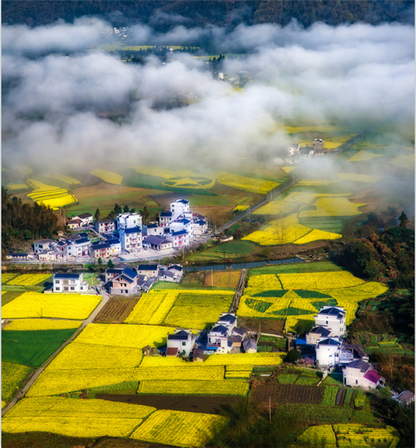 近年來,黟縣大力發展全域旅遊、鄉村旅遊,油菜花節成為每年的品牌類節慶互動。柯村三月踏春好時節,萬畝油菜花海成片,目光所及之處,蜂飛蝶舞,花田醉人,構成了一幅悠閒的鄉村春景圖。(記者 吳敏)