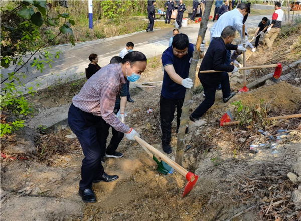 天朗氣清,春風輕拂。植樹現場一片熱火朝天的忙碌景象,大家幹勁十足,揮鍬鏟土、扶正樹苗、填土夯苗、圍堰踩實、提桶澆水,合力種下一棵棵樹苗。經過兩個多小時的緊張勞動,1600多棵樹苗沐浴着春光,昂然挺立,為大地增綠添彩。近日,植樹點所在的土洋社區榮獲2020年度「廣東省五星級宜居社區」稱號。