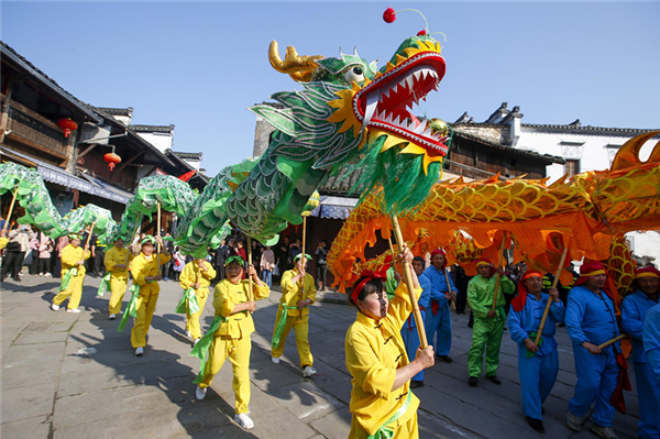 当日下午三時,伴隨著鑼鼓聲,在屯溪老街照壁廣場處,只見紅黃綠金四條布龍爭相表演,它們左盤右旋,時而上下翻滾,時而騰空飛躍,不停變換姿勢,贏得了現場陣陣叫好聲。