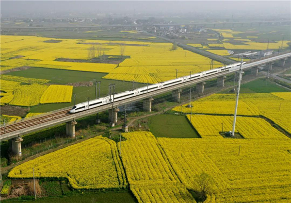 3月14日上午,我們來到夏閣鎮沿河聯圩,數百畝油菜花競相怒放。平坦筆直的村道沿線,點綴出了一幅美麗的金黃色畫卷;田野鄉村到處金浪涌動、流光溢彩,猶如給大地鋪了一張金色的地毯,怒放的油菜花搖曳着纖細的身姿;一趟趟動車組列車在花海中穿行,帶着希望開往春天。