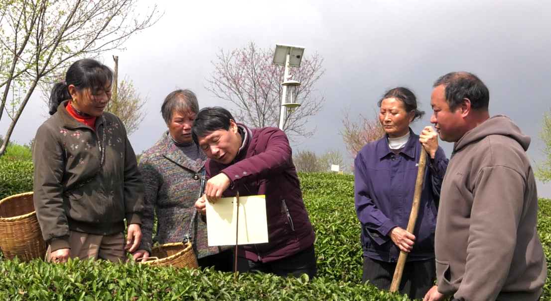 “高度離茶的距離二十到三十釐米,左右的間距不能超過五米,一般是四米到五米之間。”徽州區植保站站長方春華耐心地指導茶農進行黃板扡插,並叮囑園茶負責人程智成,搶在小葉蟬發生期把黃板掛掉。同時,結合農事操作,對茶園進行除草、施有機肥。據悉,從3月初開始,該基地每天安排十多個工人在茶園裏追肥、除草和黃板安插。