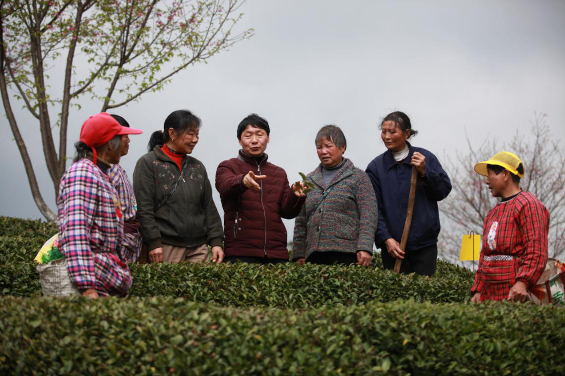 當前正值茶園管理的關鍵時期,在徽州區謝裕大茶博園茶葉基地千畝核心茶園裏,農技專家正指導著茶農們進行茶園管理,除草、追肥、扡插黃板,現場一片火熱。