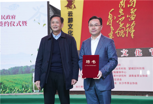 活動現場,湖南農業大學與望城區政府簽署茶業產學研基地項目合作框架協議。此次簽約內容包括人才培養與輸送、課題研究、產品研發、技術創新、技術諮詢、學術會議等方面,雙方圍繞「湖南農業大學——望城區人民政府茶樹種業聯合創新中心」,充分利用雙方優勢實現互補,進行多方位交流、多樣化協作。長沙雲遊茶業有限公司聘請湖南農業大學學術委員會主任、中國工程院院士劉仲華為雲遊茶業首席顧問,並現場頒發聘書。隨後,省科技廳副廳長周建元為「湖南農業大學——望城區茶樹種業聯合創新中心」授牌。(記者 何雯 攝影 唐露 龍宇)