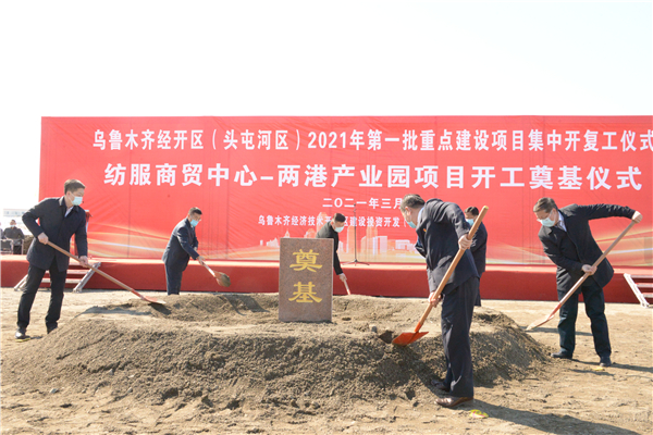 3月19日上午,烏魯木齊經濟技術開發區(頭屯河區)2021年防服商貿中心-兩港產業園項目奠基、開工。