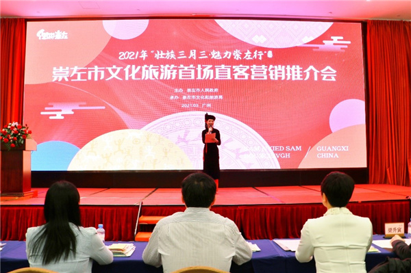 3月25日,2021年「壯族三月三?魅力崇左行」文化旅遊首場直客營銷推介會在廣州市舉辦,針對廣州市場發佈了「康養休閒遊」「邊關探秘游」「紅色文化游」「非遺生態游」等四條精品旅遊線路,讓更多的遊客感受魅力崇左,體驗甜蜜邊關。