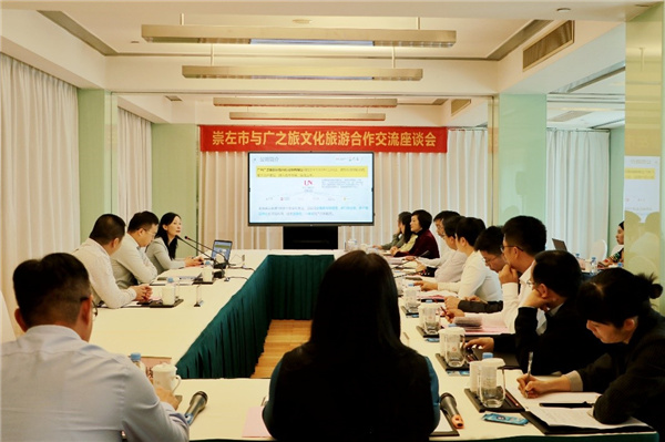 推介會期間,崇左市與廣州廣之旅國際旅行社股份有限公司開展座談交流,就崇左市如何做好粵港澳大灣區旅遊市場營銷和導客工作進行交流。(記者徐玉瑩)