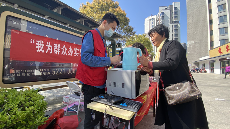 3月26日,在安徽黃山市屯溪區昱西街道黎陽街社區門口,社區的黨員志願者們和青年志願者們正在為轄區居民提供免費維修家電服務。