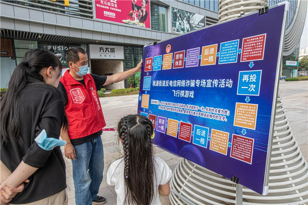活動現場,工作人員通過懸掛宣傳橫幅、發放宣傳資料、播放宣傳視頻和LED滾動屏、演繹生動有趣的情景劇等方式,向群眾宣傳當前新型的詐騙手段和經典案例。同時,工作人員還在現場指導群眾下載反詐騙APP,提醒他們切勿輕易將個人資料、卡號、存款密碼等信息告知陌生人。桃源街道還獨具匠心地設置了「飛行棋遊戲」活動區域,邀請現場居民切身體驗詐騙手段,識別「電信詐騙常用語」、「電信詐騙常用行為」,學習「電信詐騙識騙防騙技巧」,通過趣味遊戲,居民群眾進一步加深了對反詐騙知識的理解。