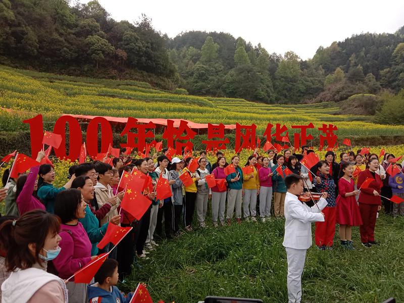 舞蹈者們現場快閃表演《唱支山歌給黨聽》,布展“100年恰是風華正茂”字樣和黨旗組合獻禮建黨百年。