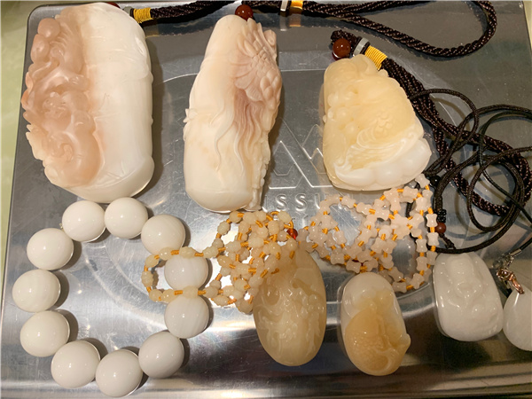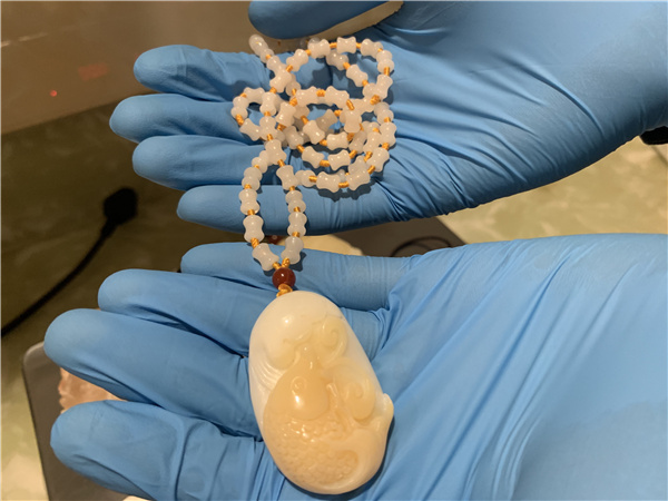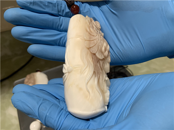 廣州白雲機場海關現場關員在對一架自非洲飛抵廣州的入境航班進行監管時,發現一名男性旅客隨身行李的X光機過機圖像異常,存在違規攜帶違禁品進境嫌疑。經開箱查驗,現場關員在其行李箱內發現1條乳白色手串及7條乳白色吊墜,均質地緊密、硬度較高,表面光滑且具有層狀結構,疑似硨磲製品,總重約1215克。後經專業機構鑑定,確認為雙殼綱簾蛤目硨磲科物種貝殼的製品。