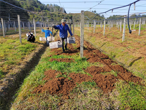 3月30日,在皖南休寧縣山鬥鄉金源村金園山有機獼猴桃示範基內,員工們正利用晴好天氣對獼猴桃樹施有機肥。
