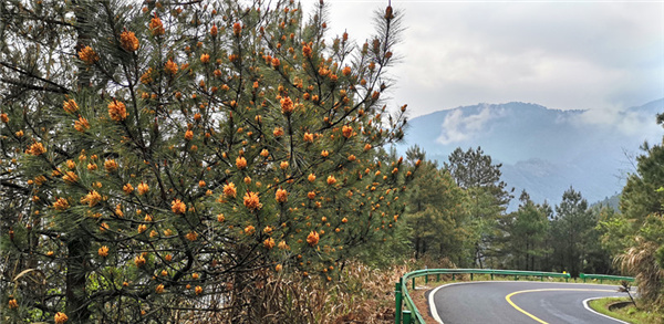 仲春時節,在皖南休寧境內的省道漁瑤公路右龍嶺沿途,松樹周身散發出光亮的新綠,沐浴著春風和暖陽,它們開始競相開花。