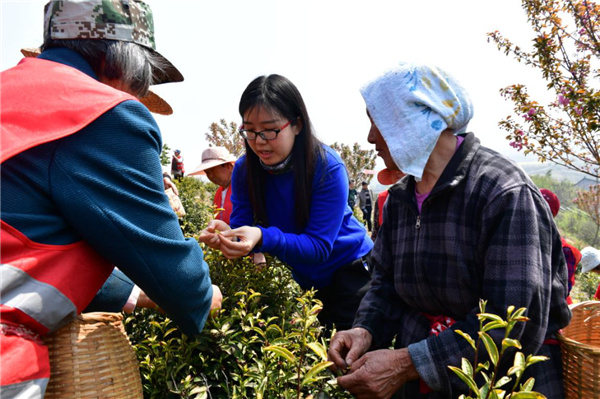 在茶園,來自巢湖市農技推廣中心副主任、科技特派員周晏也沒有閑着,來回穿梭茶園內現場指導茶農採茶。「大家在採摘時,要按照一芽一葉等級來採摘,這樣的才符合名優茶採摘標準。」科技特派員周晏不時地對茶農說。「採摘時,我們要用拇指和食指夾着芽葉的嫩梗迅速往上提,一定不要用指甲掐采,以免造成茶梗紅變;嚴格採摘標準,凍傷芽葉、病蟲害芽葉、變異芽葉及不符合採摘標準的芽葉不採,確保鮮葉質量,提高名優茶品質。」