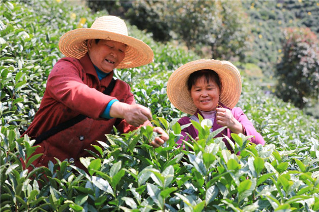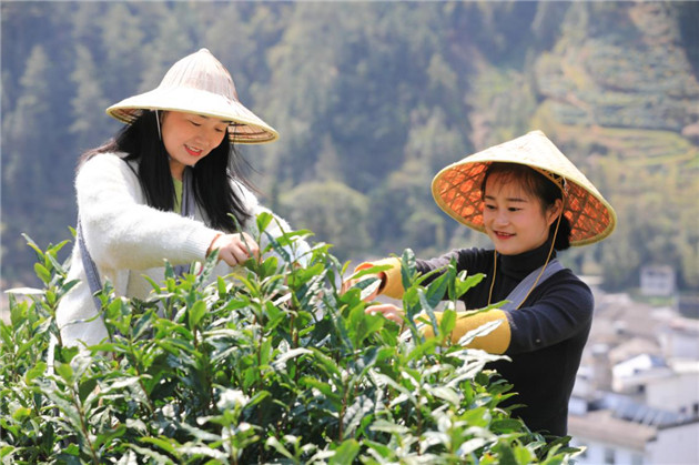 清明時節,安徽黃山市徽州區滿山遍野的茶園裏,茶農們趁著難得的降雨間隙採摘春茶,茶園一派繁忙景象。