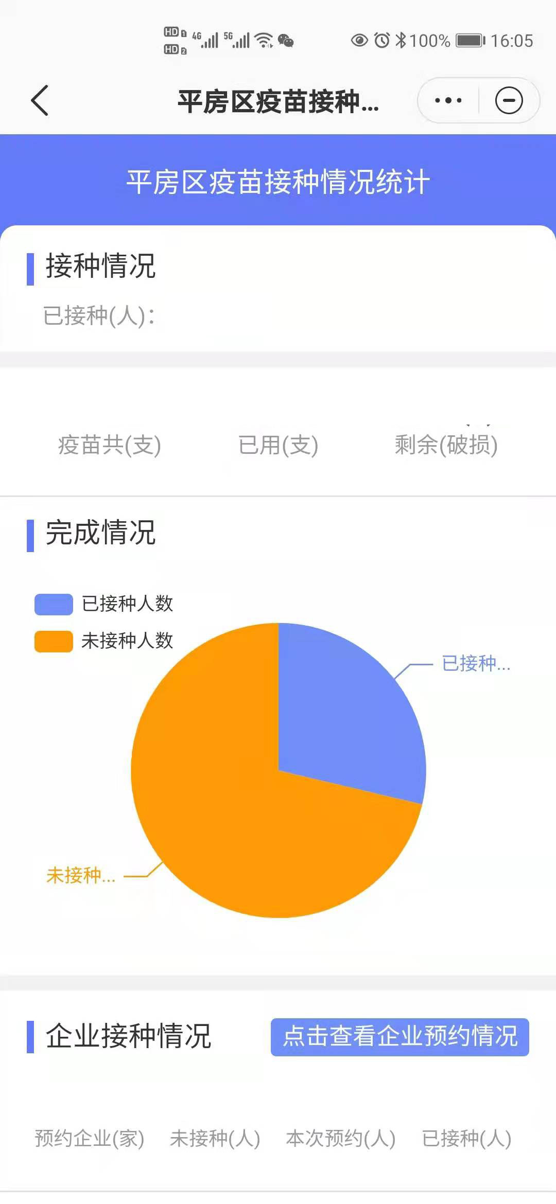 調度中心依託企業微信平台,創建企業服務組,利用轄區各行業、各片區企業商戶聯繫人微信群,多群同步收集接種意願表。企業商戶一次填報,智慧調度中心多點共享,同時掌握實時數據。開發企業預約數據統計平台,掌握企業預約人數、已完成接種人數、待接種人數等情況,輔助下一步決策計劃。同時,開發疫苗接種情況統計平台,掌控疫苗接種任務完成情況。與金苗系統對接,將金苗系統歷史數據有效化處理後導入後台,完成已接種人員基礎數據。與黑龍江省新冠疫苗預約接種平台對接,每2小時下載導入一次數據,實時更新各接種點、服務隊工作進度。截至目前,企業員工預約人數超六萬。