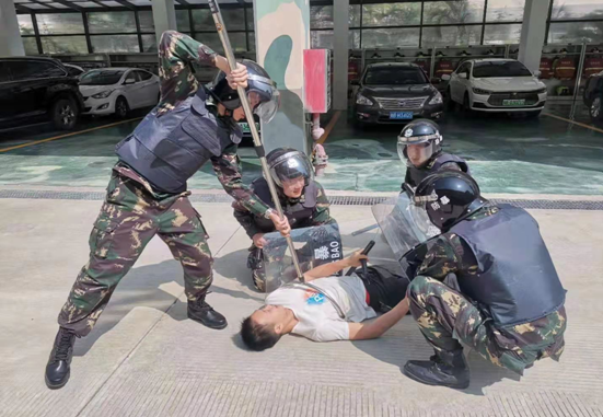 車中兩名男性人員神色慌張似有逃跑跡象,並與警戒員發生肢體衝突。警戒員立即通過對講機向應急分隊隊長報告現場情況。應急分隊隊長接到警戒組人員通知後,立即向處突隊長下達命令,要求處突隊立即趕往現場,處突隊以隊列陣勢迅速前往事發地,並警告兩名可疑人員停止反抗,可疑人員不聽處突隊的警告,甚至取出兇器繼續抵抗。處突隊立即組織防爆隊形,兩名可疑人員見勢不妙,急忙逃竄。處突隊果斷出擊,成功將他們制伏,當場繳獲兇器,並將他們押送至看守地點。