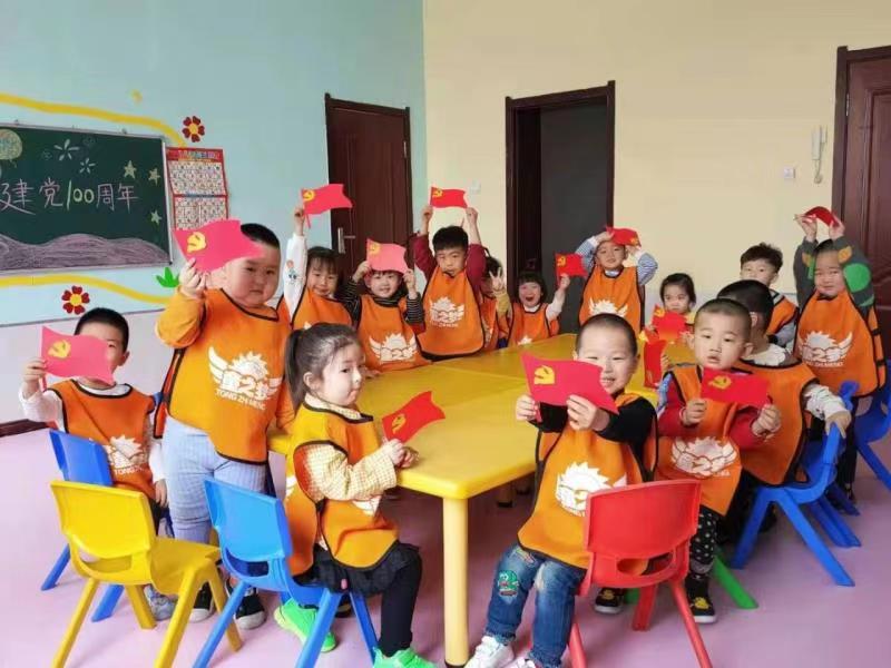 講解結束後,幼兒園大班的小朋友們拿起畫筆繪製黨旗,一筆一畫間滿是熱愛;中班的小朋友在老師的指導下,小心翼翼的把剪好的錘子、鐮刀黨旗標誌粘貼在紅色卡紙上,完成一面面黨旗小作品;小班的小朋友隨着《閃閃的紅星》歌曲的節奏揮舞起手中的小國旗。具有針對性的課堂內容,讓孩子們在潛移默化中加深對黨的認知,對祖國的熱愛。