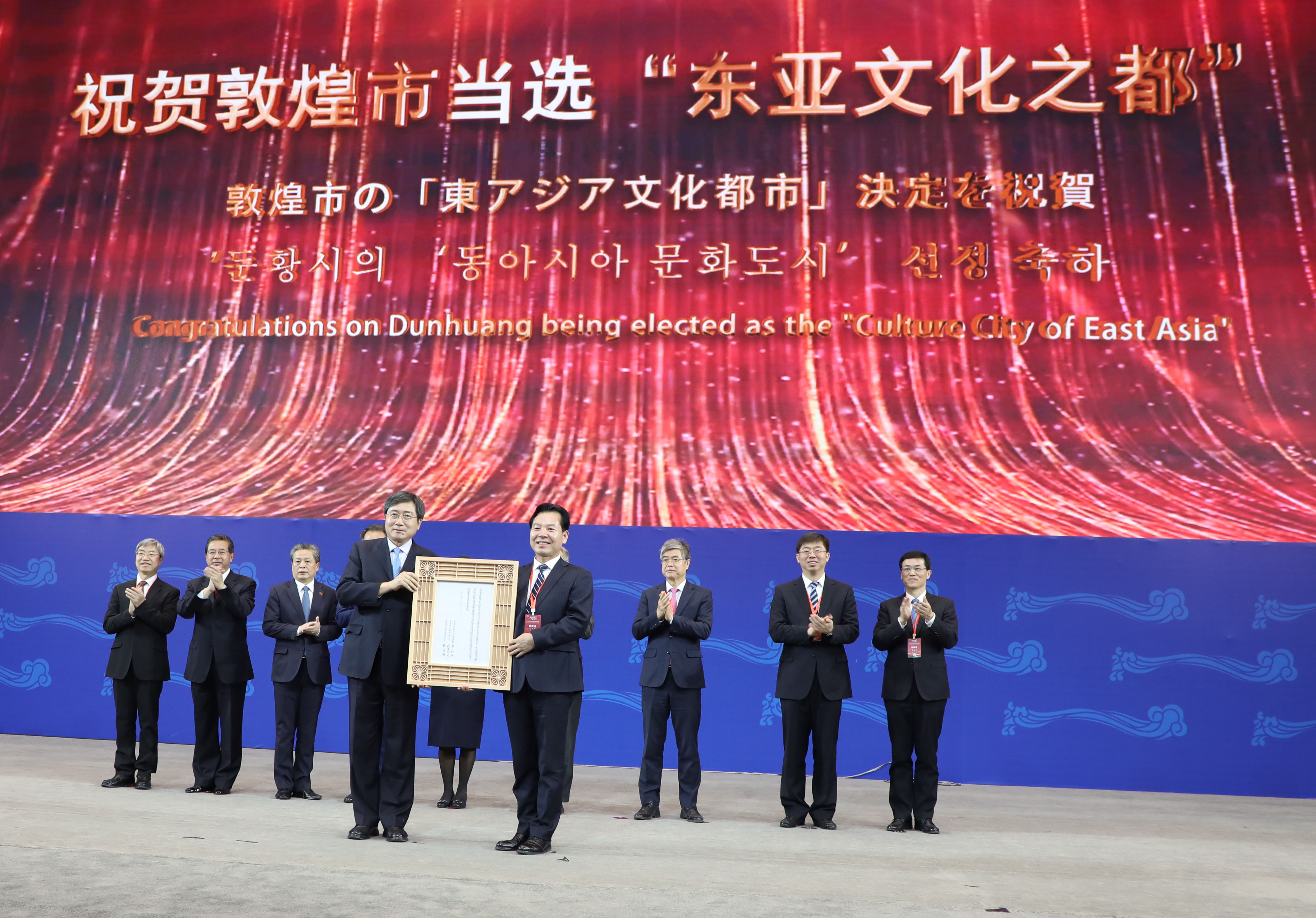 4月9日,2021「東亞文化之都」·中國敦煌活動年正式啟幕,文化和旅遊部副部長張旭在開幕式上向敦煌市頒授2021「東亞文化之都」紀念牌。