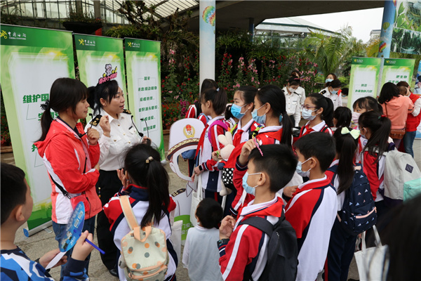 廣州海關聯合華南植物園開展「維護國門生物安全,共建美麗生態家園」全民國家安全教育主題活動,廣州海關關員向參與活動的小學生普及國門生物安全知識。