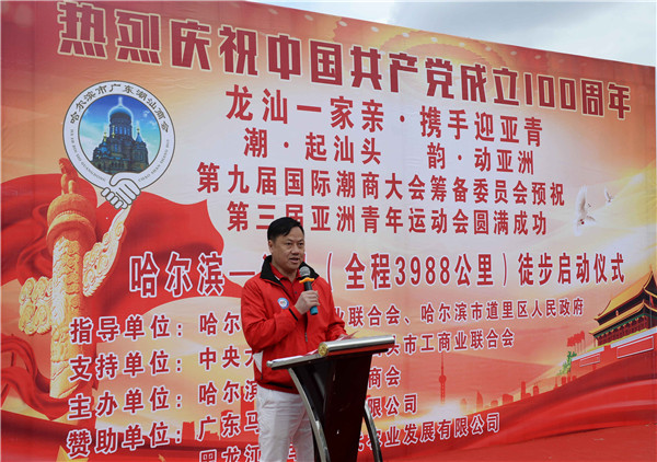 第九屆國際潮商大會主席、哈爾濱市廣東潮汕商會會長鄭楚成表示,今年是中國共產黨成立100周年,是無數英雄為中華崛起付出生命而值得紀念的一年,大會以徒步形式發揚黨的無畏困難,進一步加深哈爾濱市與汕頭市的交流與合作,為高質量振興黑龍江經濟騰飛添磚加瓦。(記者 張曉磊)